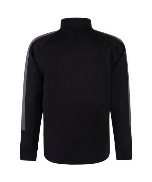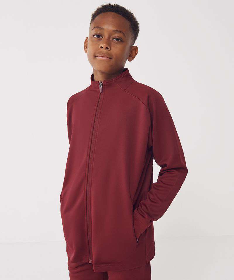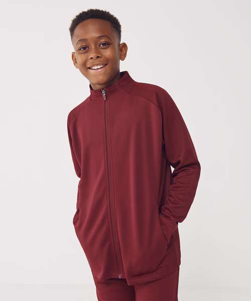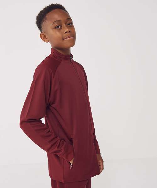 Knitted tracksuit top with contrast colour panels on outer sleeve. Contrast colour centre front zip. Zipped side pockets. Funnel neck and 1x1 ribbed cuffs. Semi-automatic lock zip sliders on all zips.