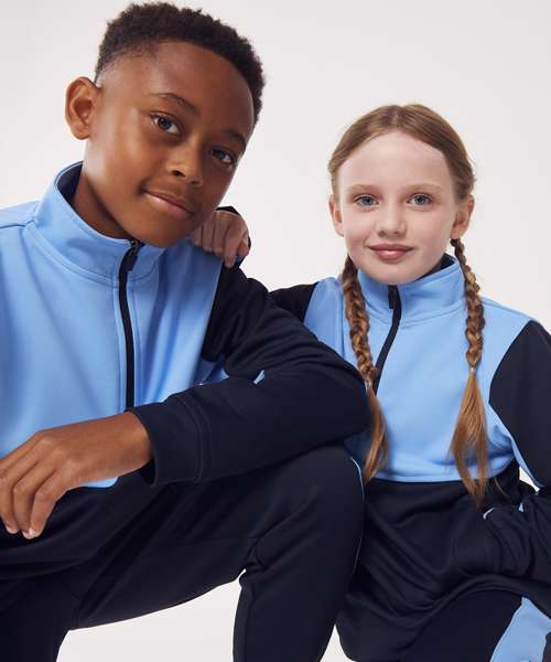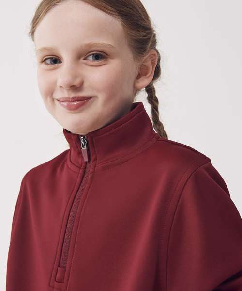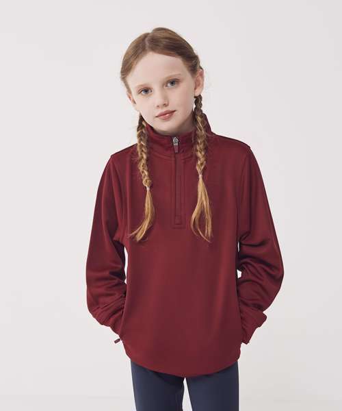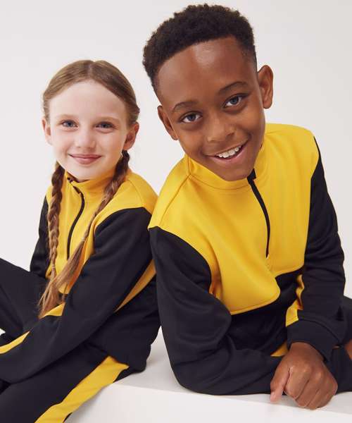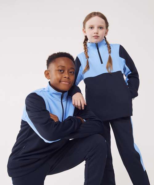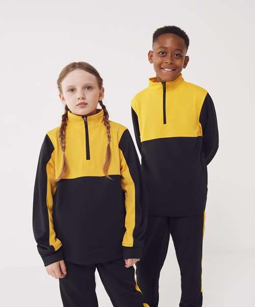 Contrast upper chest and underarm panels. Quarter zip. Side panels. Reverse nylon zips centre front and side pockets. 1x1 ribbed cuff sleeve. Semi-automatic zip pull and slider.