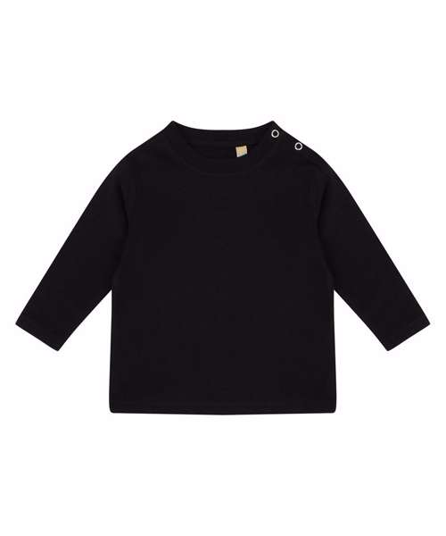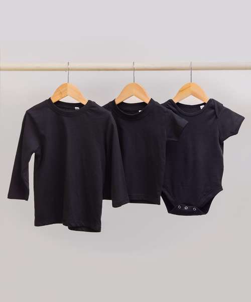 Children's crew neck t-shirt with popper detail on shoulders. Twin needle stitching on hem and cuffs. Rib detail at neck.