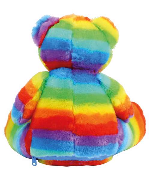 Multi-coloured soft plush bear. Contrast sewn nose and eyes. Cream coloured panel on tummy and feet. Zip access on the base of the bear for direct access onto the tummy for embroidery. Removable inner stuffing. Can be embroidered or sublimation printed. Complies with EN71 European Toy Safety regulations. Remove all hang tags and their fasteners before giving these items to a child. Suitable for children of all ages.