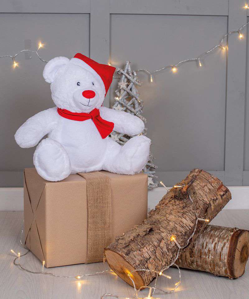 The Christmas Zippie bear has a zip around the bottom to allow direct access for decoration. Removable inner stuffing. Sewn eyes and mouth. Red knitted scarf with red Christmas hat over one ear. Suitable for all ages. Complies with EN71 regulations.