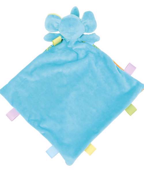 Multi-coloured elephant comforter with internal rattle. Bright blanket with patchwork panels and fabric tabs. Zip access on the comforter to allow for direct access to print or embroider. Complies with EN71 European Toy Safety regulations. Remove all hang tags and their fasteners before giving these items to a child. Suitable for all ages.