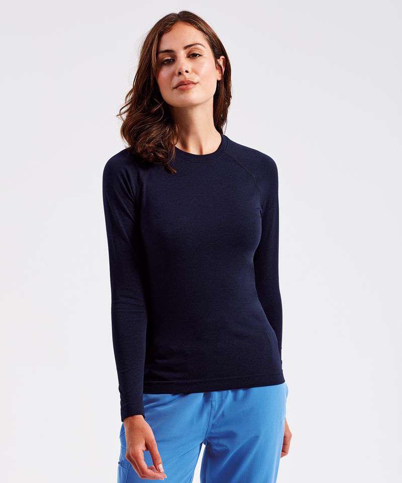Women’s long sleeve underscrub baselayer. Comfortable four-way stretch. Breathable, easycare, crease-resistant fabric. Deodorising properties. Crew neck, raglan stitched sleeves. Seamless body with jacquard pattern. Decorate with embroidery and/or print. Contains certified recycled nylon.