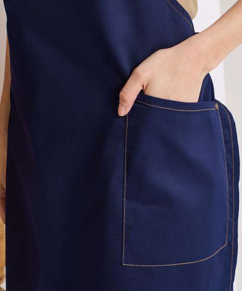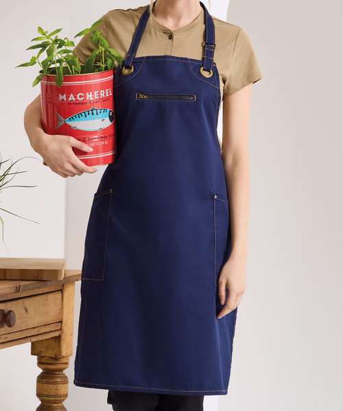 An full bib apron made with a combination of certified recycled polyester cotton. Featuring two handy side pockets with rivet detail. The centre zip pocket comes away to the underside to allow embroidery applications. Contrast stitching features across this apron and oversized antique brass eyelets give an industrial-chic feel to the design. Eyelet and rivet detail. Adjustable antique brass buckle on neckband. Side pockets and centre zipped pocket.
