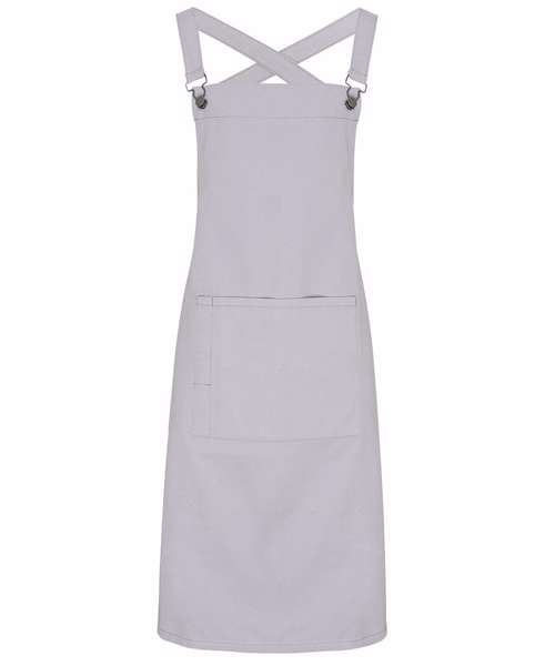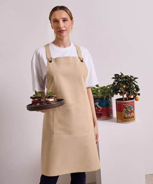 Self-fabric ties that are fastened to the main body of the apron with dungaree style buckles. The straps then hook over the shoulders, cross over at the back, loop through the large eyelets at the waist and tie neatly at the back. Also features a useful front centre pocket with combined pen slot. This style is designed to be paired with our PR119 Interchangeable apron straps should you want a contrast colour or fabric to the main body of the apron.