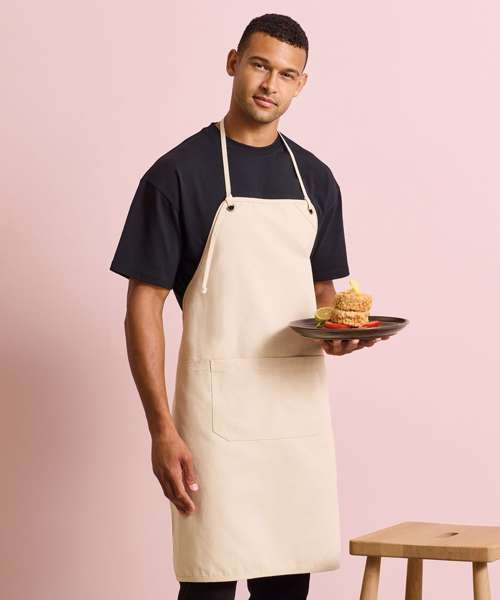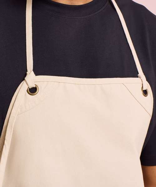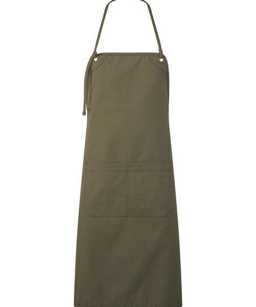 Heavyweight canvas bib apron that can also be folded down to form a half-waist apron. Rounded edges. Gunmetal/antique brass eyelets. Mitred double pocket. Adjustable knotted neckband and matching waist ties that can be fastened to the front or back. Cotton-rich with certified recycled polyester.