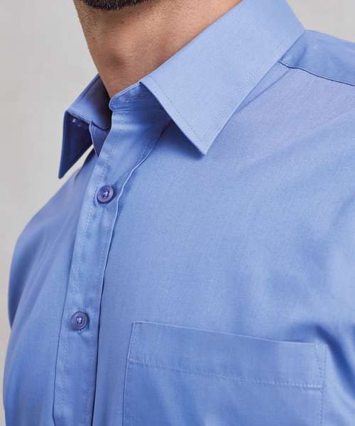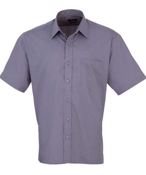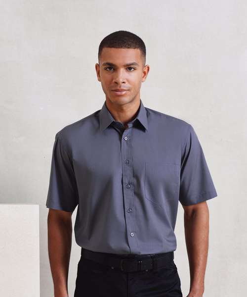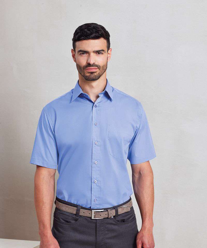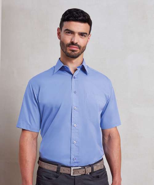 A short sleeve work shirt for men. This shirt has a stiffened formal cut collar that can accommodate a tie and the main body has a useful left breast pocket.