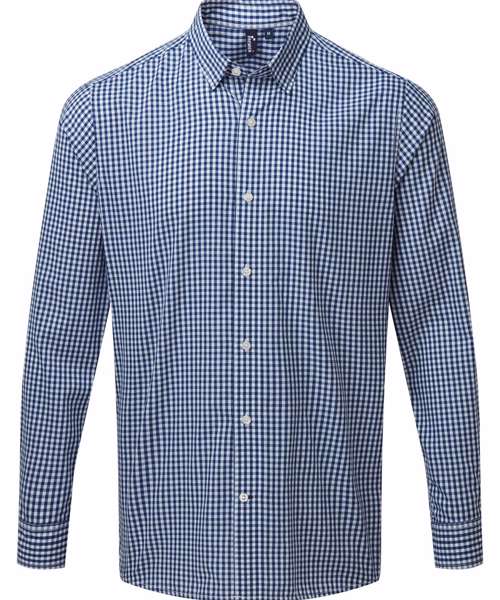 An attractive long sleeve gingham patterned shirt in strong contrast colours. Featuring a single buttoned cuff and sleeve guard. Styled with a narrow soft collar with button down options on the underside. An easycare and durable men's chequered shirt that gives a charming, vintage-chic approach to front-of-house service.
