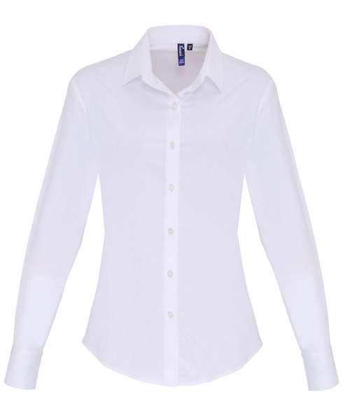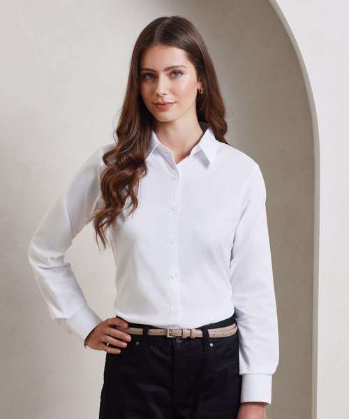 Ladies signature Oxford long sleeve blouse with wrinkle free finish for a smart and professional appearance. Soft collar styling. Rounded bottom hem. Fitted styling with bust and back darts. Pearlised buttons on light blue and white shirt, self colour buttons on remaining. Double buttons on cuff.