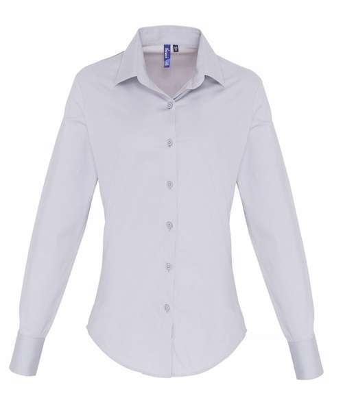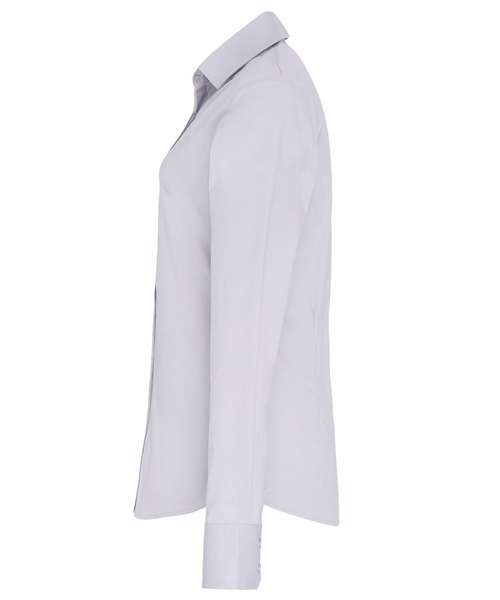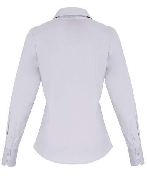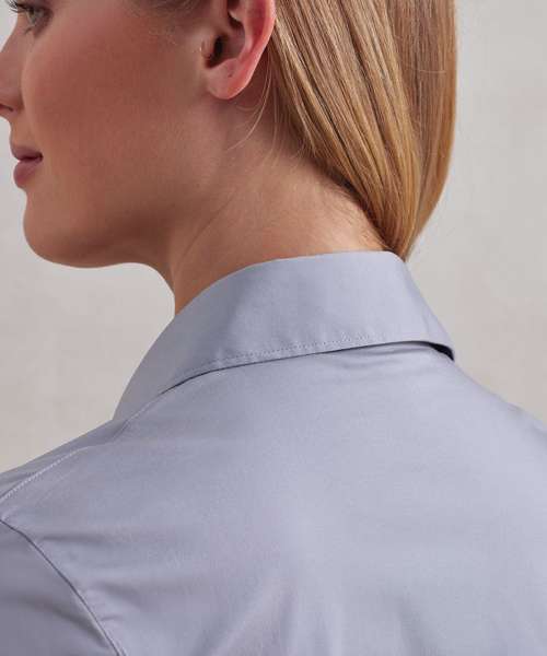 Cotton combined with elastane makes for a super soft, stretchy and comfortable fitted shirt for ladies. Double buttons on the cuff, together with a single button sleeve guard allows for a either a formal arm or a more casual roll back option. Styled with a soft cut-away collar with top button- which again, can be worn formally with a scarf or open collared for a more relaxed look.