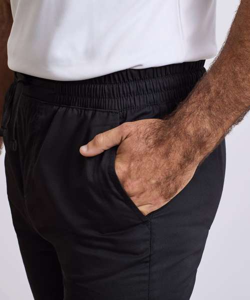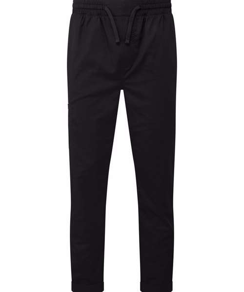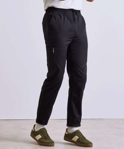 Lightweight chef’s cargo trousers made with certified recycled polyester. Elasticated waistband and drawcord. Mock stitched fly. Two side swing pockets. Welt pocket to the upper right leg with combined pen pocket. Single welt pocket to the reverse with press stud tab for fastening. A tapered fit to the lower leg with optional turn-up hem for styling.