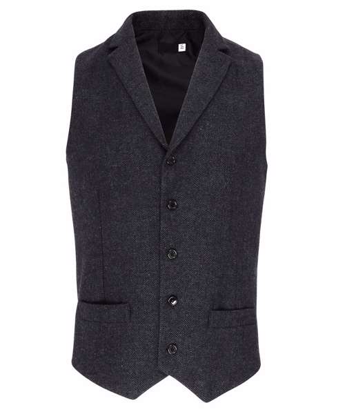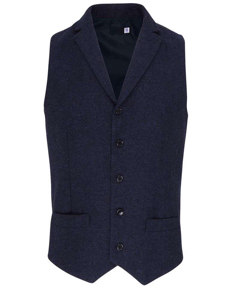 An attractive, versatile waistcoat for men. Styled with a lapel collar that leads into the main body of the waistcoat with five button fastening. The herringbone pattern has been achieved by two coloured yarns being woven together. This waistcoat is fully lined on the underside and to the reverse where there is a buckle for the wearer to adjust accordingly. Features two front open pockets.