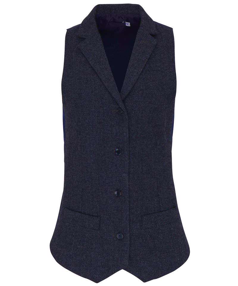 An attractive, versatile waistcoat for ladies. Styled with a lapel collar that leads into the main body of the waistcoat with four button fastening. The herringbone pattern has been achieved by two coloured yarns being woven together. This waistcoat is fully lined on the underside and to the reverse where there is a buckle for the wearer to adjust accordingly. Features two front open pockets.