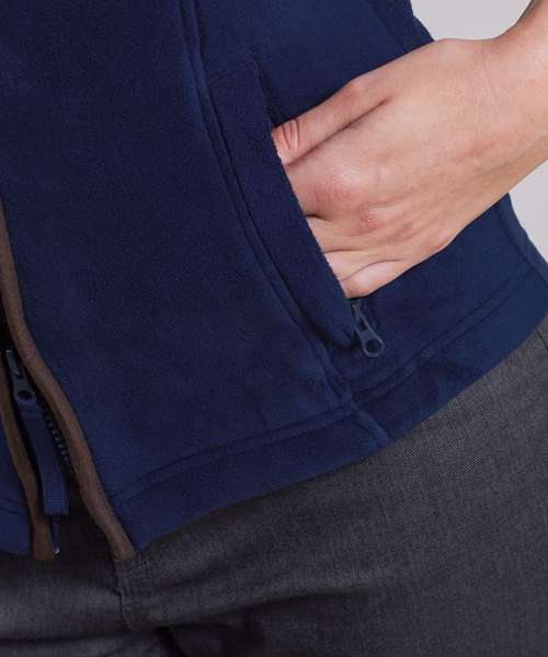 The perfect solution for those who need an extra layer of warmth when serving outdoors. This sleeveless women’s gilet allows complete freedom of movement in the arms for ease of service, and the two-way zipper enables staff to unfasten from the hem up, to access a pocket apron underneath. Designed with a slight curve to the back hem for a more feminine look. Contrast trim detail to the pockets, arm holes, collar and zip completes this attractive fleece gilet.