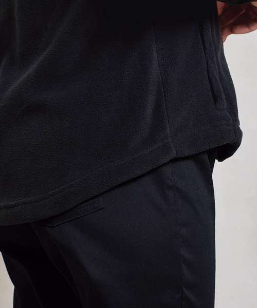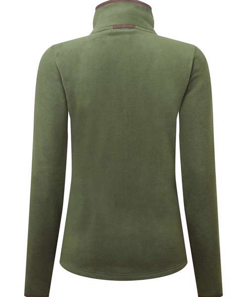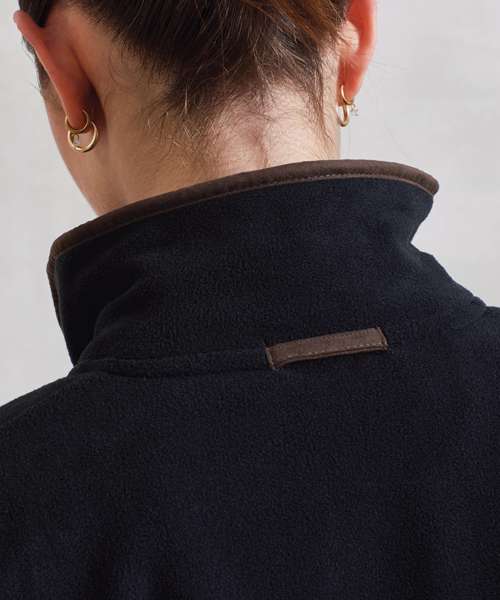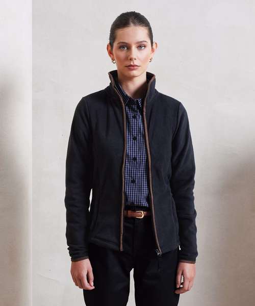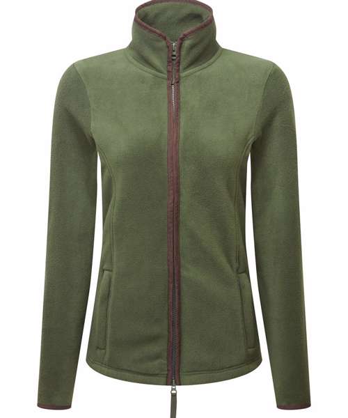 Women’s long sleeve fleece jacket with contrast trim detail. High neck rounded collar, leading into a two-way zipper. Two zipped external pockets and two internal open pockets. Stitched side panel detail. Elasticated cuff with trim detail. Contrast fabric hook on back of collar for hanging up.