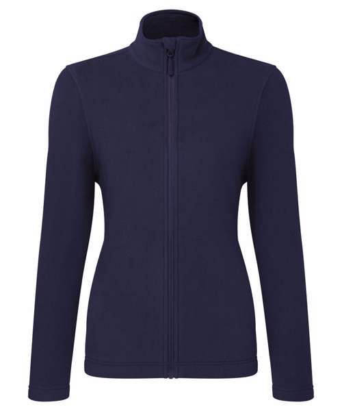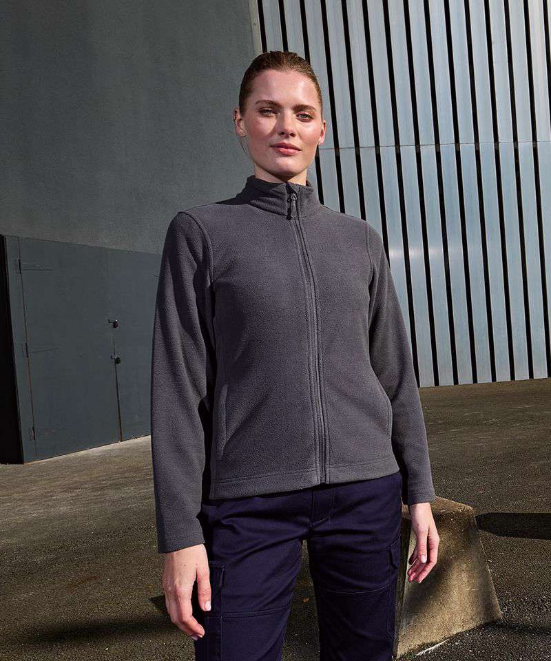 Women’s full-zip microfleece. Anti-pill fabric prevents bobbling. Self-coloured zip pull. Chin guard and storm flap. Cadet collar. Side panels. Side seamed open pockets. Straight finished hem. Made from 100% certified recycled polyester.