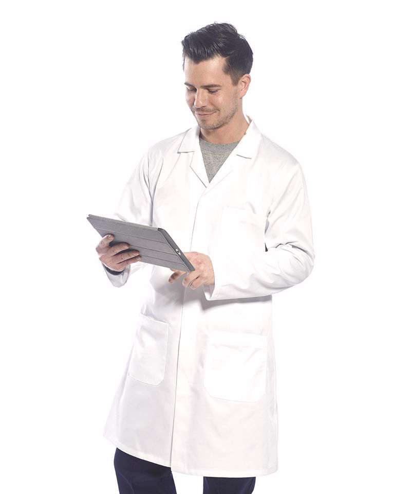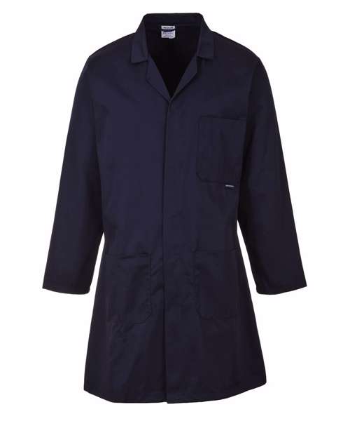 Back vent. 1 breast pocket. Concealed stud front. 2 lower patch pockets. Length 100cm.