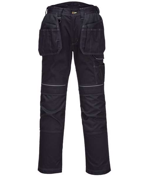 Contrast colour stitching. Contrast panels. Double rule pocket. Hammer loop. Reflective piping. Side pockets. Triple-stitched seams. Two back patch pockets. UPF 50+. Side elastic waist. Holster pockets. Gripper elastic on inner waist. Top-loading knee pad pockets. Smart phone pocket. D-ring. 12-pockets. Cargo pocket on side leg. Adjustable leg length. Reinforced panels . Durable polycotton fabric.
