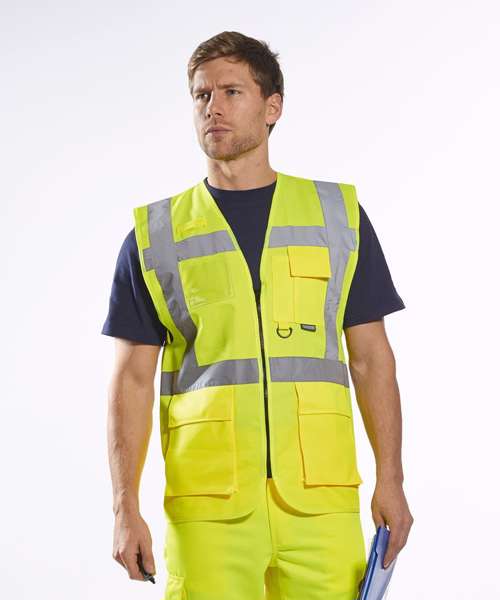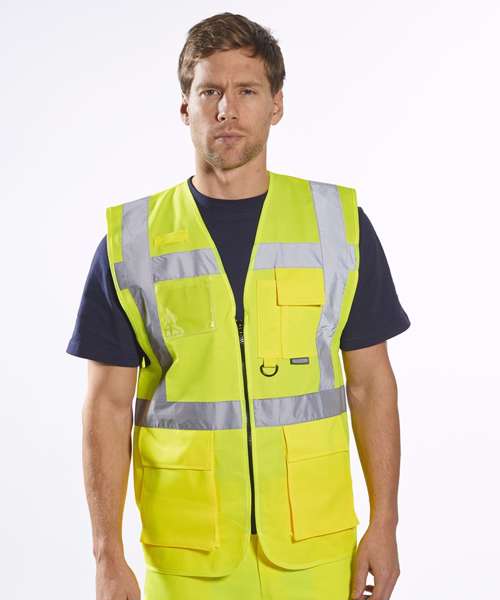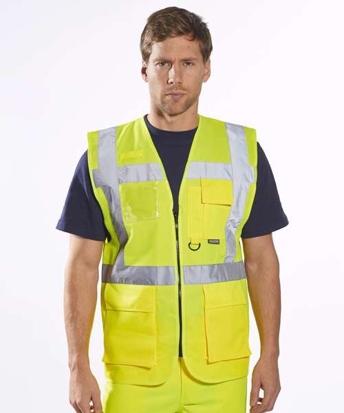 PW924 (S476) Yellow EN ISO 204714 CLASS 2. Revolutionary in its design, the executive vest combines the light weight of a waistcoat with the practicality of pockets for those situations when a jacket may be too warm. A clear ID pocket for security passes and cards complements this unique garment. CE certified. Reflective tape for increased visibility. Front zip opening for easy access. Concealed mobile phone pocket. Phone and pen holder pocket. Radio loop for easy clipping of a radio. Dual ID holder allows use of both portrait and landscape ID card display. D-ring for keys or ID cards. PW924 (C476) Yellow /Navy EN ISO 204714 CLASS 1. This two-tone option executive vest range is available in Yellow/Navy.