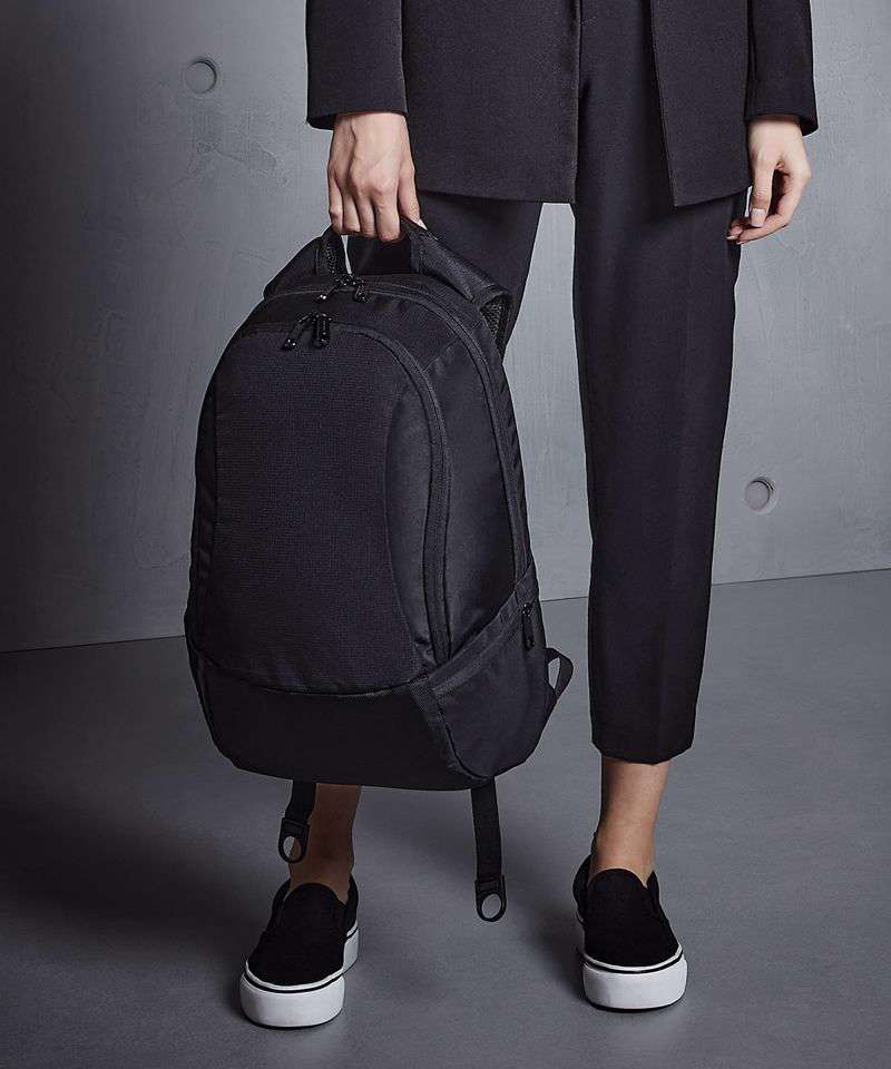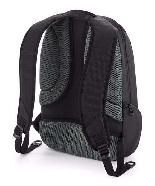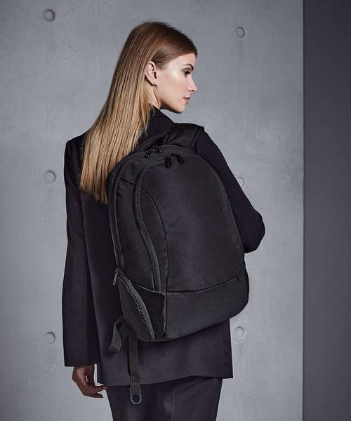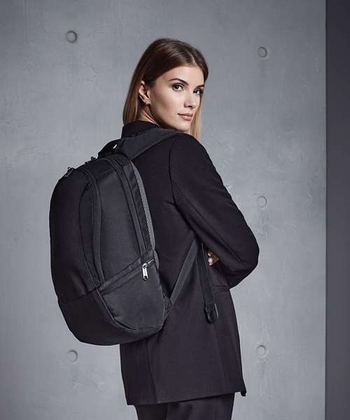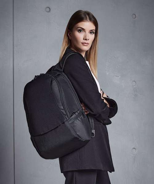 TearAway label for ease of rebranding. External access padded laptop compartment. Plush lined laptop pocket. Laptop compatible up to 15.6". Elasticated cable organiser. Key hook. Internal organiser section. Zippered internal valuables pocket. Zippered side pockets. Lockable zip pullers. Ergonomic padded back panel. Padded adjustable shoulder straps.