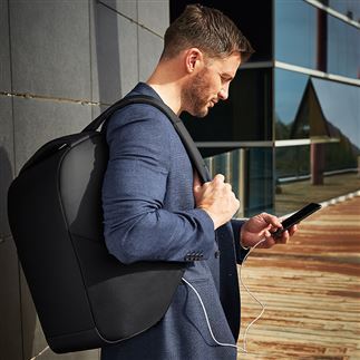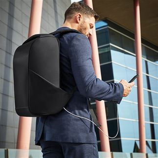 TearAway label for ease of rebranding. Minimalist styling. Lightweight yet durable. Slash-proof construction. Padded internal iPad/ Tablet compartment. Padded laptop compartment, compatible up to 17". Hidden access main compartment. Padded zippered internal pocket. Structured divider offering dedicated packing space. Multiple internal pockets. Power bank pocket. Integrated USB charging port. Elasticated cable organiser. Key hook. Fully lined. Discrete zippered back panel pocket. Wheelie bag strap. Fully adjustable chest strap. Ergonomic padded back panel. Padded adjustable shoulder straps. Fairtrade certified.