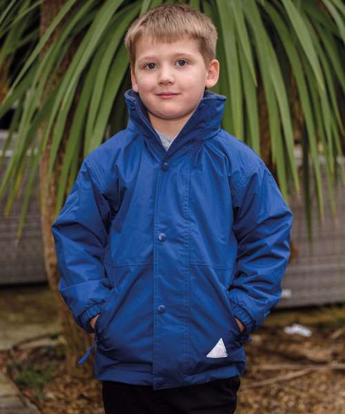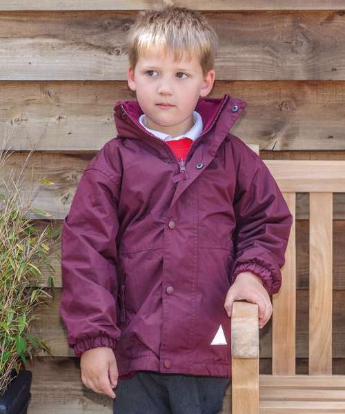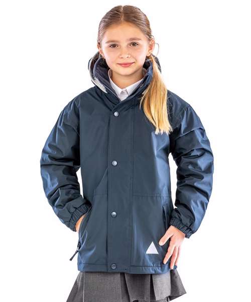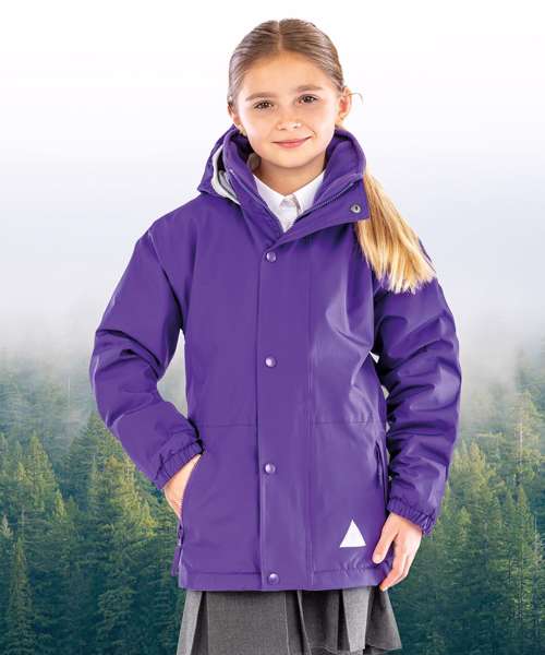 Self-coloured fabric outer hang loop. Reflective triangles front and back. Heavy-duty full zip-through collar. Double-stitched taped seams. Stud closing outer storm flap. Concealed integral hood. Zip closing side pockets. Elasticated cuff. Stand-up collar. Inside pocket. Made with 100% recycled polyester.