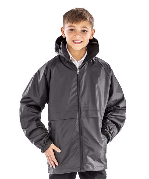 Waterproof (2000mm), lightweight, windproof. Outer: StormDri PU coated polyester. Inner: 100% Polyester 180gsm microfleece body and sleeve lining