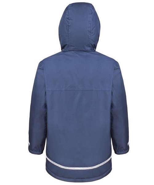 Waterproof-StormDri 2000. Windproof. Fully taped waterproof seams. Long fit. Super warm. Concealed 3-panel hood in collar. Full front heavy duty zip. 2 concealed front pockets with storm cover. Super warm fleece-lined collar. Reflective cuff. Fleece-lined front pockets. Adjustable drawcord hem. Ready to brand cut cut-away label. Decorating methods: Embroidery, Direct print, Transfer print. Decorators access point: Full hem and left chest.