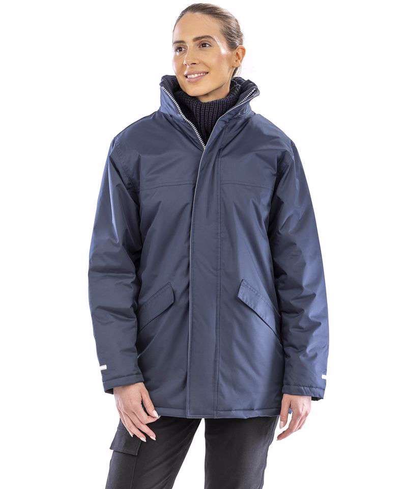 Waterproof-StormDri 2000. Windproof. Fully taped waterproof seams. Long fit. Super warm. Concealed 3-panel hood in collar. Full front heavy duty zip. 2 concealed front pockets with storm cover. Super warm fleece-lined collar. Reflective cuff and back detail. Name and class tag inside left pocket. Fleece-lined front pockets. Adjustable drawcord hem. Ready to brand cut cut-away label. Decorating methods: Embroidery, direct print, digital transfer print, and screen print transfer. Decorators access point: Full hem and left chest.