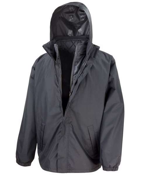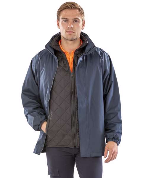 Waterproof StormDri 2000. Fully taped seams. Windproof. Stylish fit 3-in-1 combination with quilted bodywarmer. Two front pockets with storm flaps. Inside the right chest pocket on the outer jacket. Fully integrated hood. Full-length zip fastening on outer and inner bodywarmer. Two side pockets on the bodywarmer. Ready to brand cut cut-away label. Decorating methods: Embroidery and Transfer print. Decorators access point: Open.