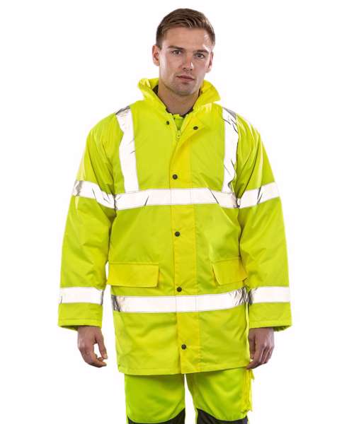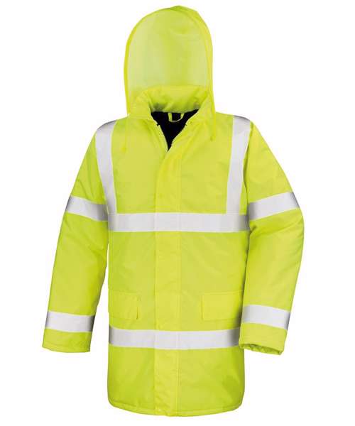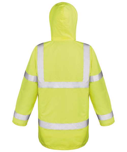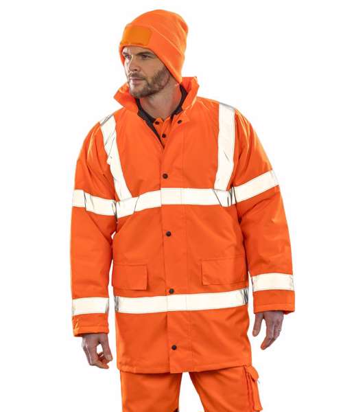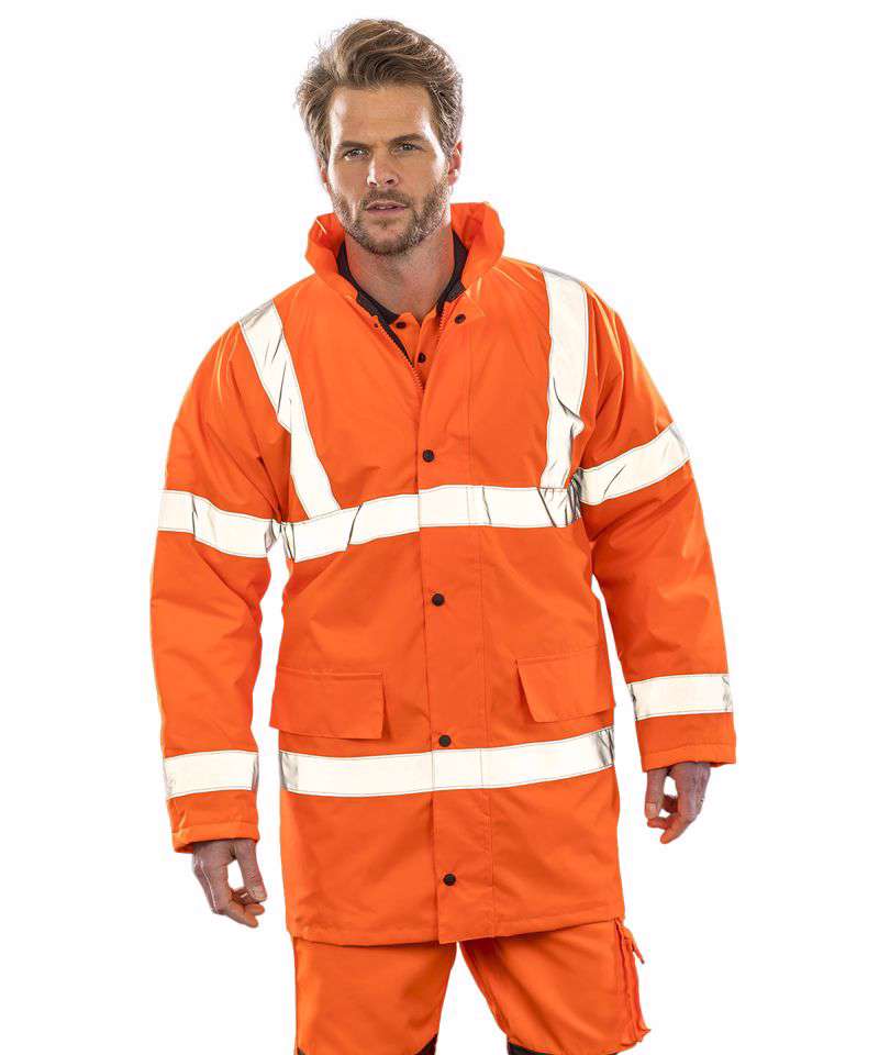 EN ISO 20471:2013 + A2:2016 Class 3; RIS-3279-TOM ISSUE 2:2019 CLASS 3 (orange only). Fully taped waterproof seams, full-length durability. Waterproof 1000mm. Windproof. Excellent warmth factor. Foldaway adjustable hood in collar. Heavy-duty full front zip fastening. Stud closing storm flap. Inside the right pocket. 50mm sewn-on safety tapes. Two side pockets with storm cover. NB: These garments should be worn and kept clean to maintain effectiveness. Ready to brand cutaway label. Decorating methods: Embroidery, Direct print, Transfer print. Decorator's access point: Back hem.