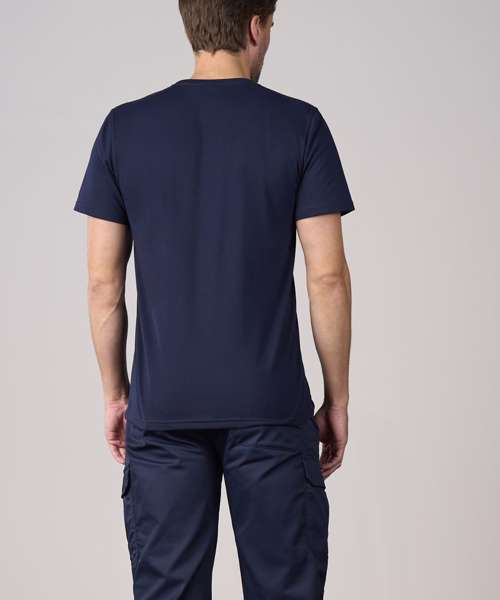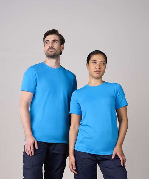 Short sleeves. Ribbed self-coloured crew neck collar. Self-coloured taped back neck and shoulder. Twin-needle stitching on neck and armhole. Side seams. Twin-needle stitching on sleeve and bottom hem.