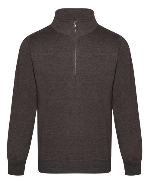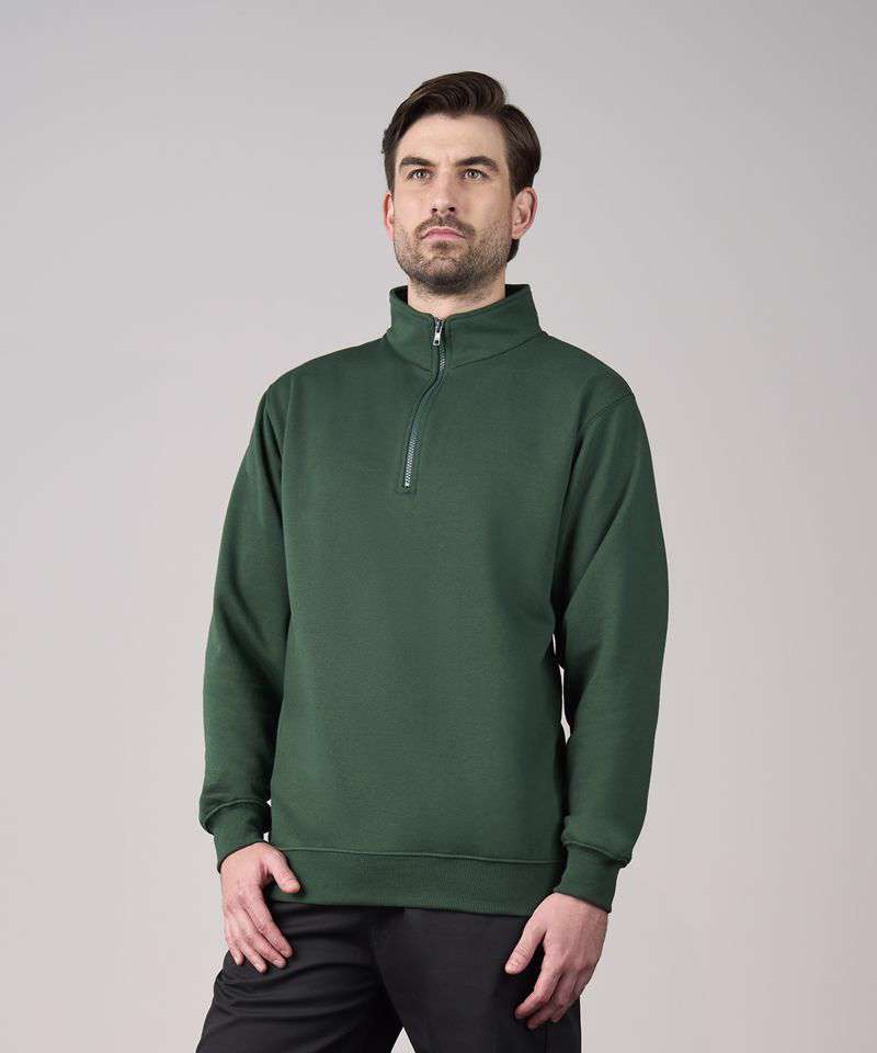 YKK zip and pull. Twin-needle stitching at arm, cuff and hem. 2x1 rib on cuff and hem. Heavier-weight fabric. Modern yet comfortable fit. Half-zip neck. Brushed inner fleece.