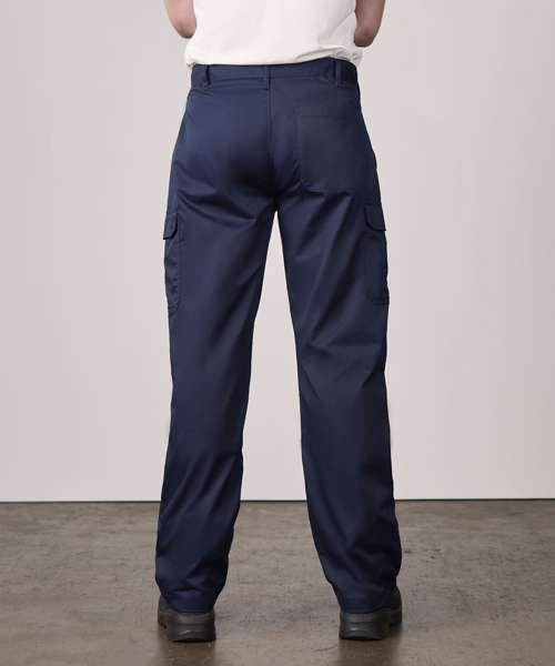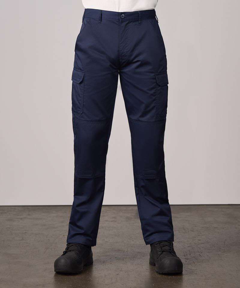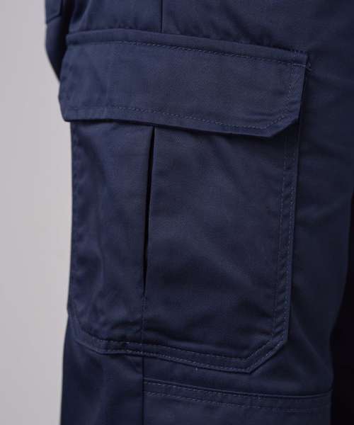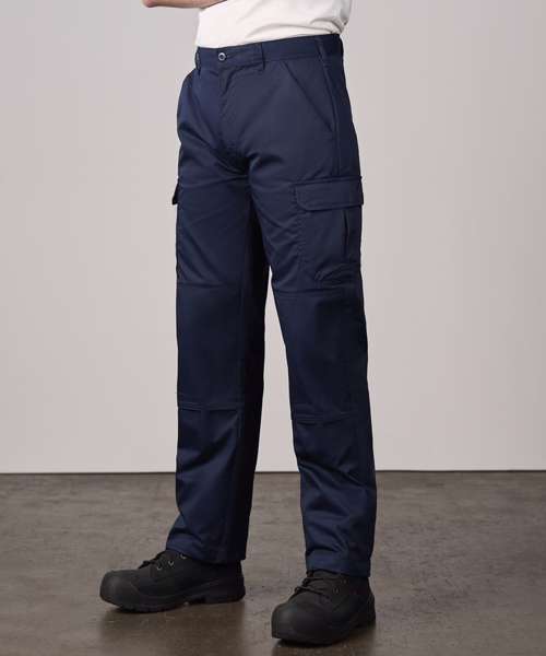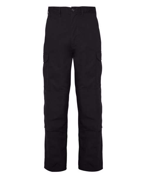 Traditional waistband with belt loops and regular front swing pockets. Conceal zip fly. Two cargo pockets on both legs. One back open pocket. Knee pad pockets with tear and release fastening.