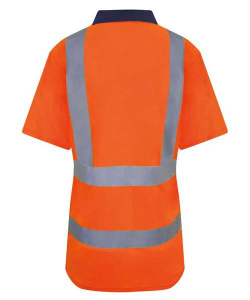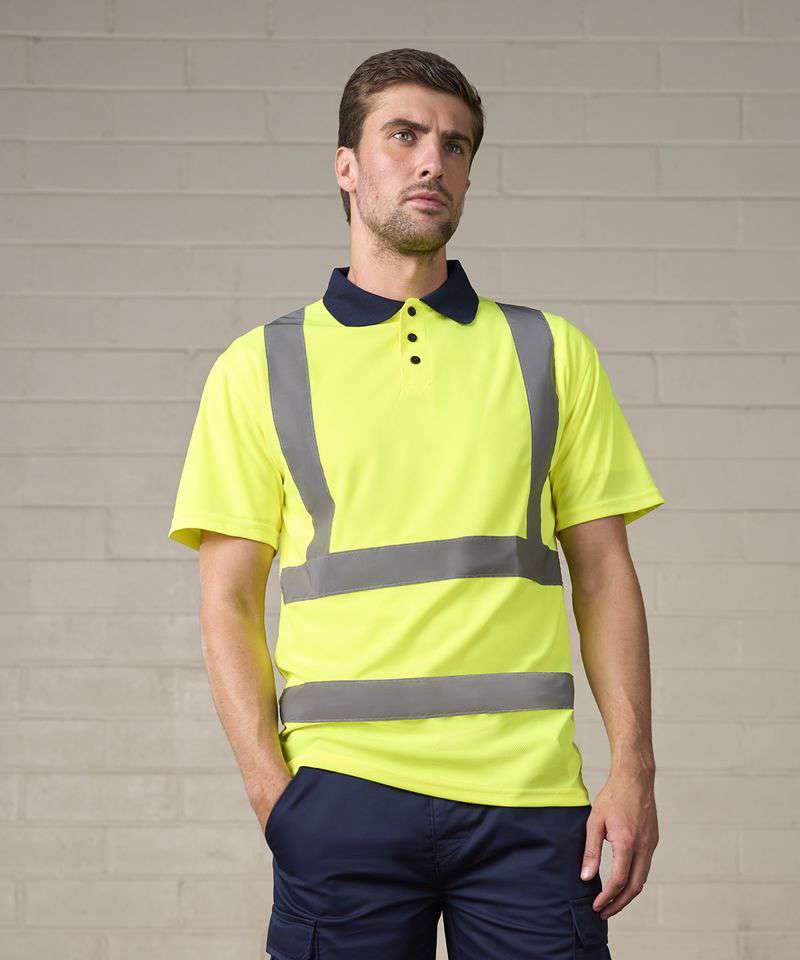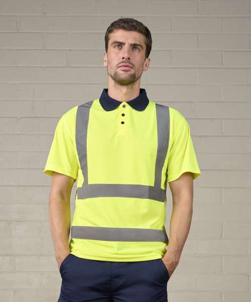 Certified EN ISO 20471:2013+A1:2016. RIS-3279-TOM ISSUE 1:2016 (Orange only). HV Orange/Navy & HV Yellow/Navy - Class 2. Ribbed contrast colour collar. 3-button placket, contrast colour buttons plus 1 spare. Twin-needle stitching on shoulder. Twin-needle stitching on sleeve and bottom hem. Side seam vents. Over shoulder and around body reflective tapes. Around body tape finishes before the side seam for comfort and ease of fit.