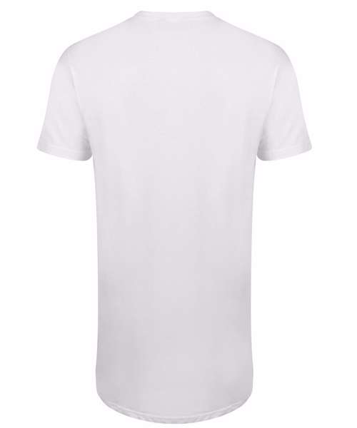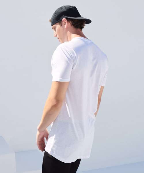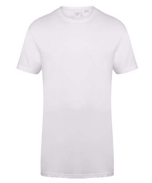 Tear-out SF (Skinnifit) label. Regular fit at chest and shoulders. Extra-long length, with longer dipped hem at back. Twin-needle stitching. Stretch rib neck.