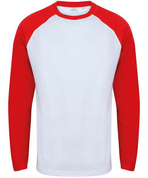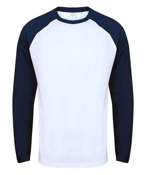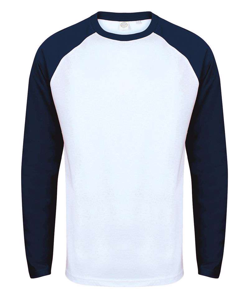 Tear-out SF (Skinnifit) label. Contrast raglan sleeve and ribbed neck with back-neck tape. Long-line. Twin-needle curved hem. Matches Ladies' SK271 and Kids' SM271 Long Sleeved Baseball T's.