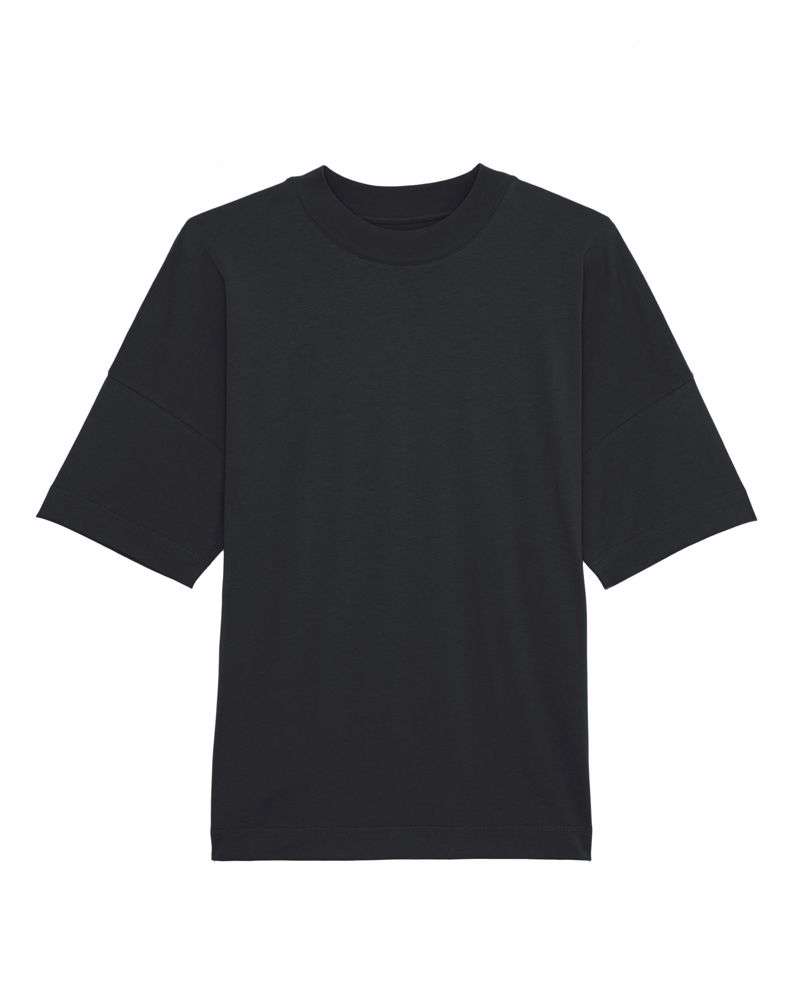 Set-in sleeve. Dropped shoulder. Wide 1x1 rib neck collar with single topstitch. Inside back neck tape in self-fabric. Sleeve hem and bottom hem with wide double topstitch.
