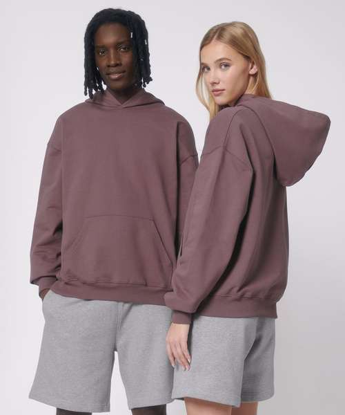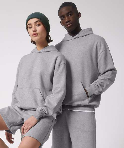Unisex boxy dry hand-feel hoodie sweatshirt. Set-in sleeve. Double-layered hood in self-fabric. Inside single Jersey back neck tape. Self-fabric half-moon at back neck. Single needle topstitch at neckline and along hood opening. 2x1 rib at sleeve hem and bottom hem. Armhole, sleeve hem and bottom hem with twin-needle topstitch. Kangaroo pocket at front.