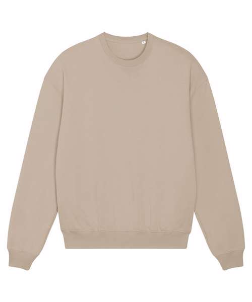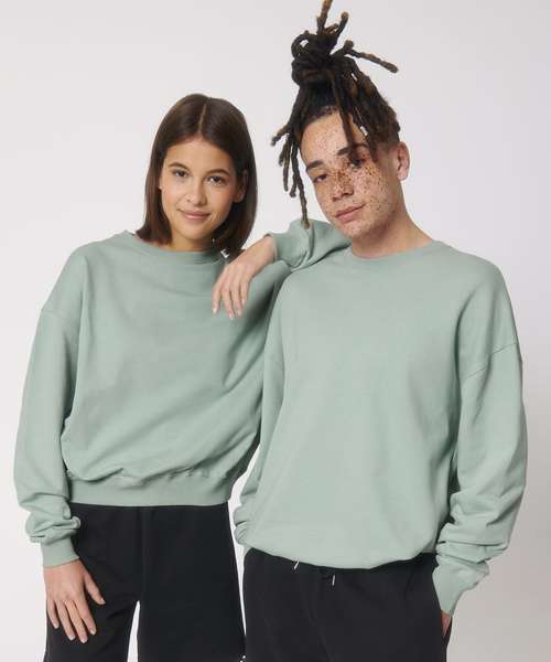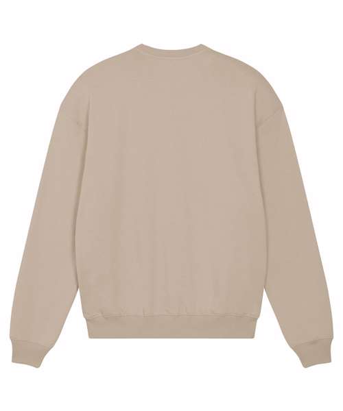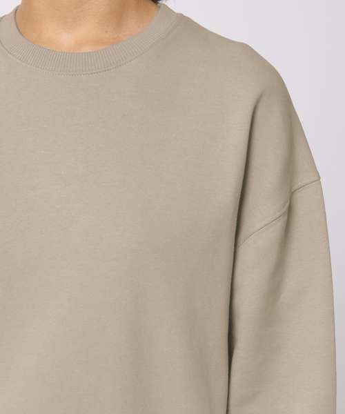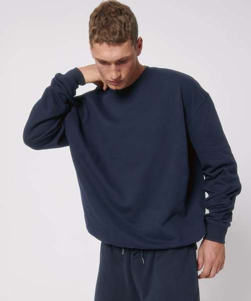 Unisex boxy dry hand-feel crew neck sweatshirt. Set-in sleeve. 2x1 rib at neck collar, sleeve hem and bottom hem. Herringbone back neck tape. Self-fabric half-moon at back neck. Armhole, sleeve hem and bottom hem with twin-needle topstitch.