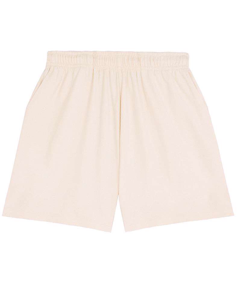 Unisex lightweight shorts. Self-fabric elastic waistband. Hidden flat drawcords on inside waistband. Pockets at front. Patch pocket at back. Bottom hem with narrow double-needle topstitch.