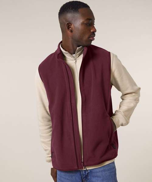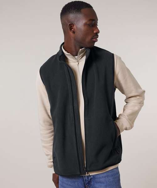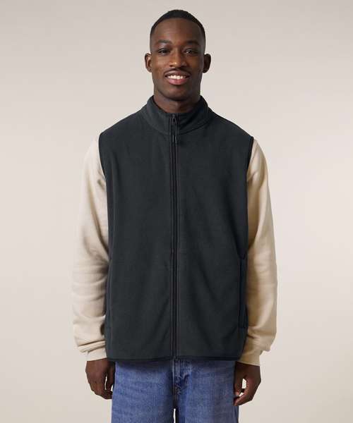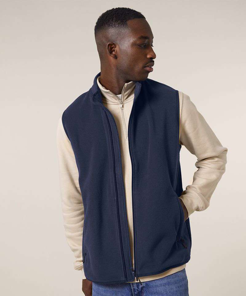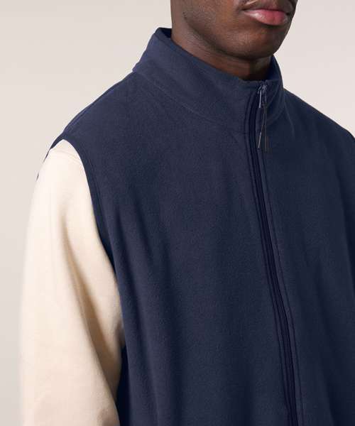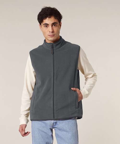 Sleeveless. Elastic binding at neck edge, armhole and hem. Inside back neck grosgrain loop. Nylon coil zip with metal zip pull and cord ending. Brushed fabric with anti-pilling finish on the inside and outside. Front side welt pockets with zip opening. Inside back neck tape in recycled polyester.