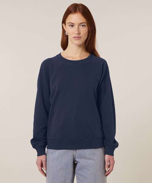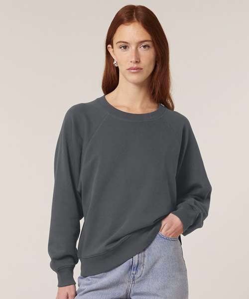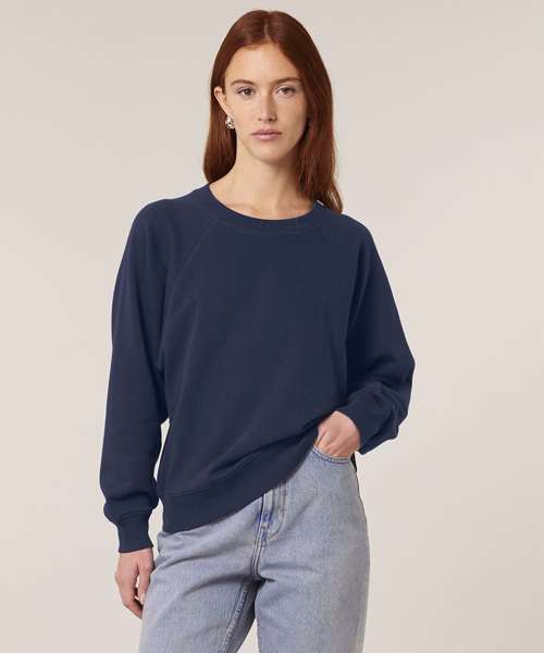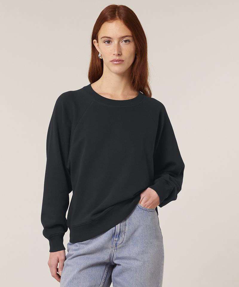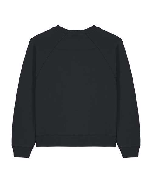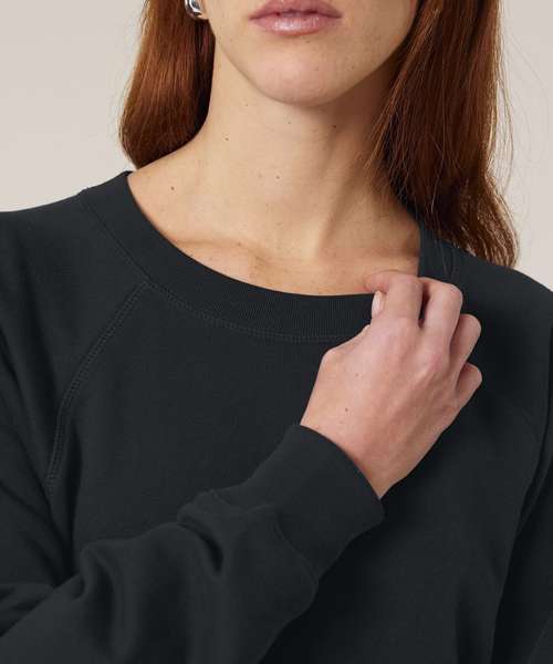 Raglan sleeves. 2x1 ribs at collar, sleeve cuffs and bottom hem. Three-needle flatlock stitches at neck, sleeves, side seams and half moon. Two-needle stitches at the bottom hem and sleeve cuffs. Inside grosgrain back neck tape. Self-fabric half moon at back neck.