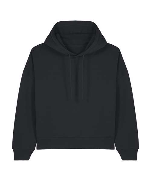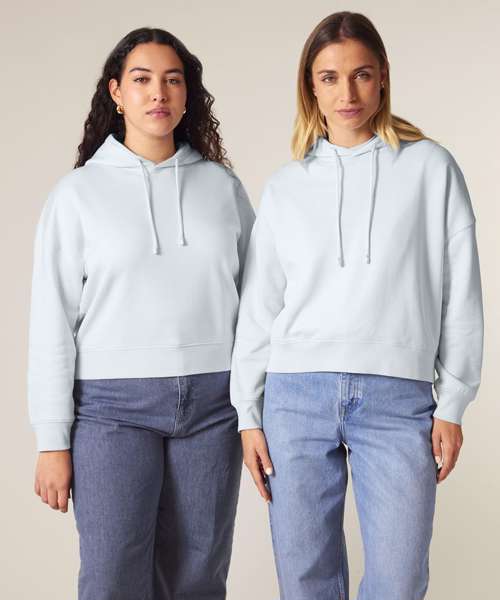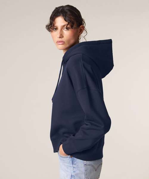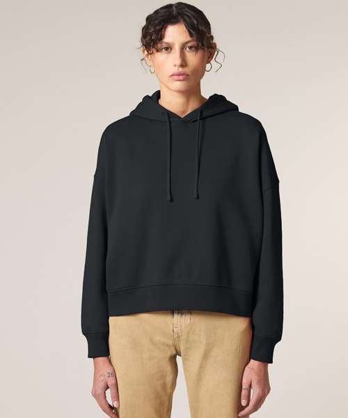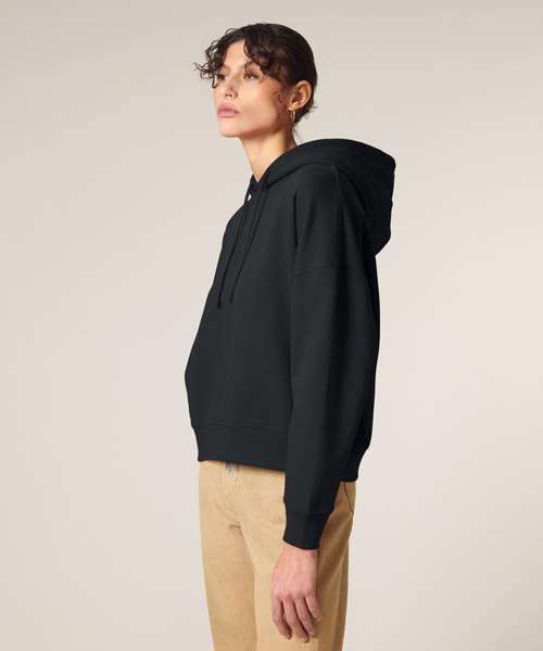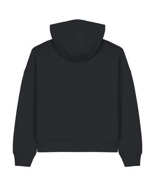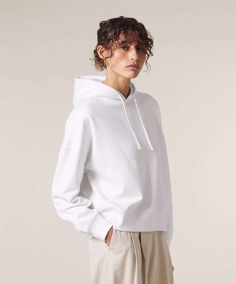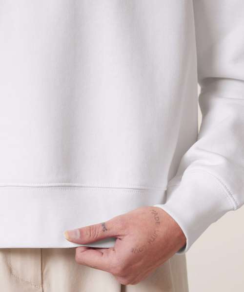 Set-in sleeves. Dropped shoulders. Double-layered hood in self-fabric. Flat drawcord in matching body colour. Embroidered eyelet. 1x1 ribs at sleeve cuffs and bottom hem. Two-needle topstitches on all seams. Inside grosgrain back neck tape. Self-fabric half moon at back neck.