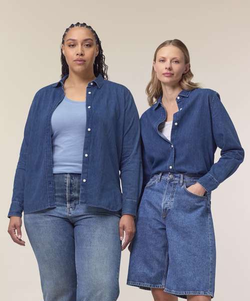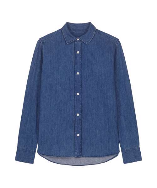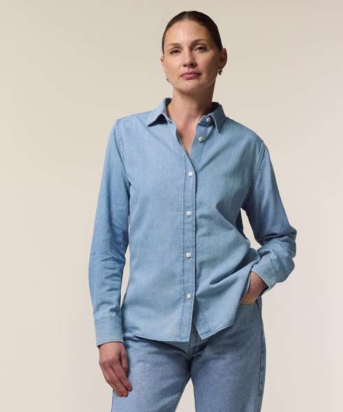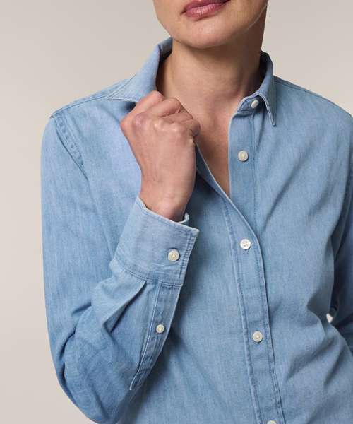 The Stella denim shirt for women. Medium fit. Point collar with single-needle topstitches. Collar stand with one contrast button. Front placket with single-needle topstitches on each side. Forwarded shoulder. Back yoke. Inside yoke in self-fabric. Set-in sleeves. Sleeve placket with one button. Cuff with two buttons. Straight cuff corners. Double pleats at cuff seam. Faded look on all seams due to garment washing – indigo yarn dyed product – so each garment may vary in appearance.