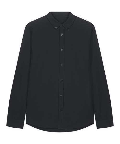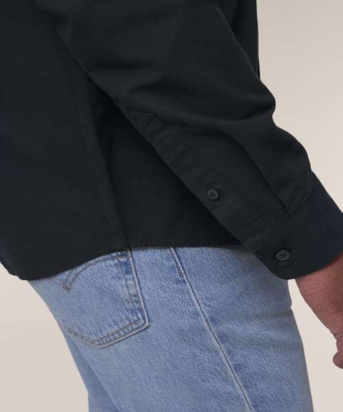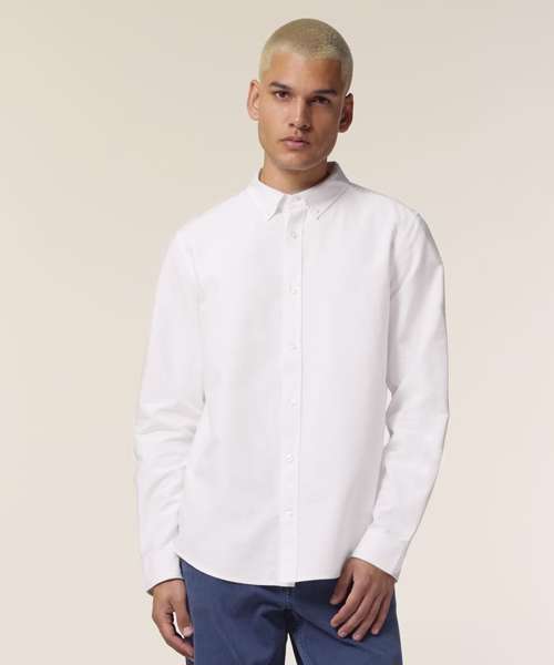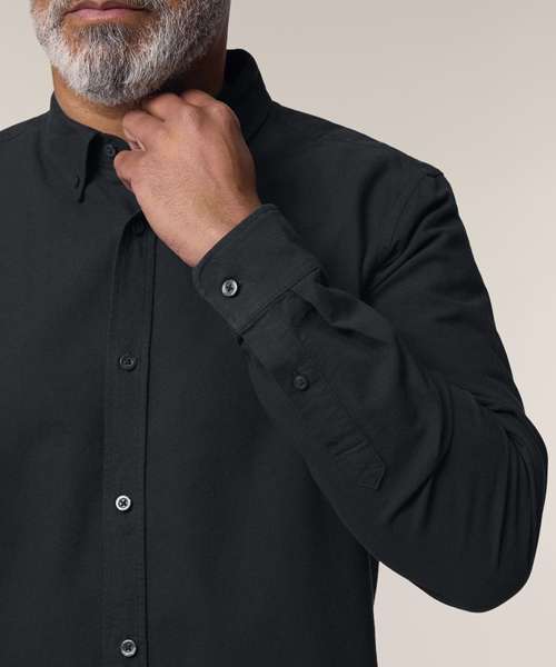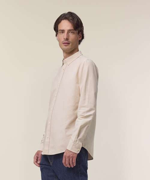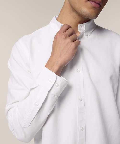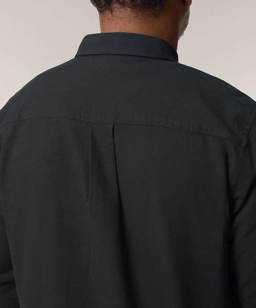 The Stanley Oxford shirt for men. Medium fit. Button-down collar with single-needle topstitches. Collar stand. Front placket with single-needle topstitches on each side. Forwarded shoulder. Back yoke with box pleat. Inside yoke in self-fabric. Set-in sleeves. Sleeve placket with one button. Cuff with two buttons. Rounded cuff corners. Double pleats at cuff seam.