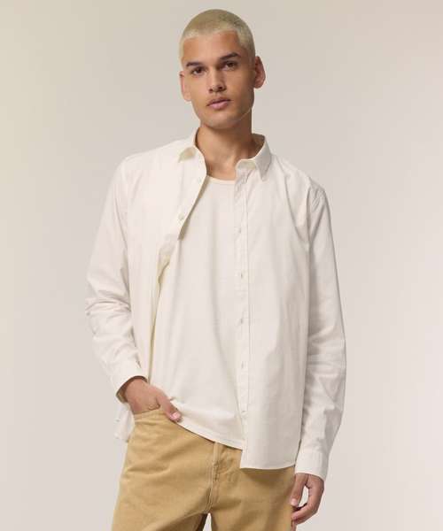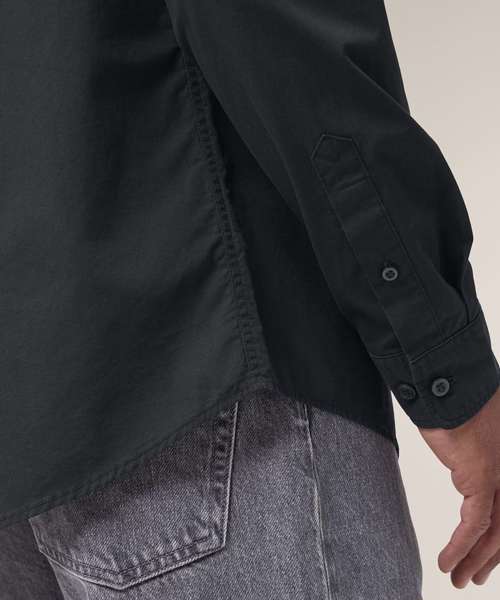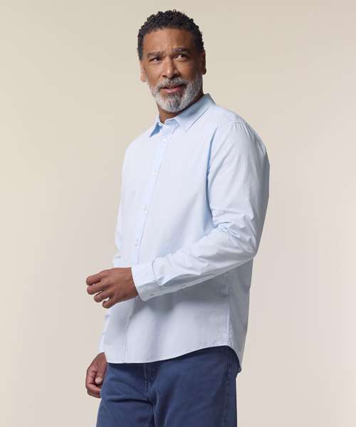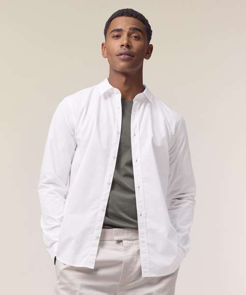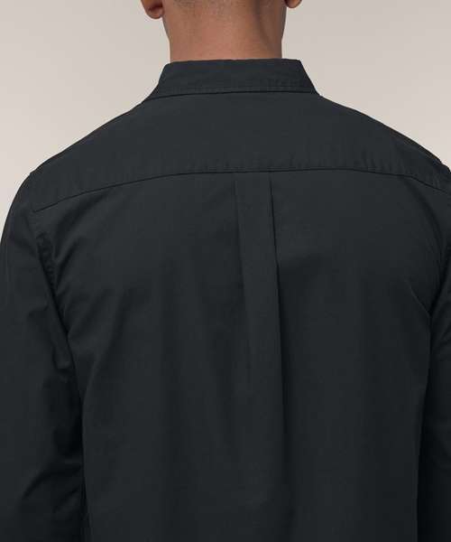The Stanley Styler poplin shirt for men. Medium fit. Point collar with single-needle topstitches. Collar stand. Front placket with single-needle topstitches on each side. Forwarded shoulder. Back yoke with box pleat. Inside yoke in self-fabric. Set-in sleeves. Sleeve placket with one button. Cuff with two buttons. Rounded cuff corners. Double pleats at cuff seam.