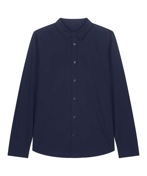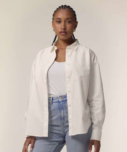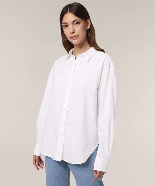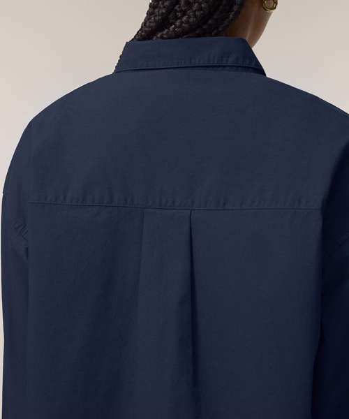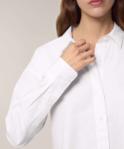 The Stella Styler poplin shirt for women. Relaxed fit. Point collar with single-needle topstitches. Collar stand. Grown-on-placket with single-needle topstitches on each side. Forwarded shoulder. Back yoke with box pleat. Inside yoke in self-fabric. Dropped shoulders. Sleeve placket with one button. Sleeve cuff with two buttons. Rounded cuff corners. Double pleats at cuff seam.
