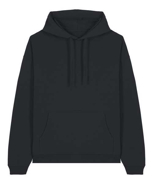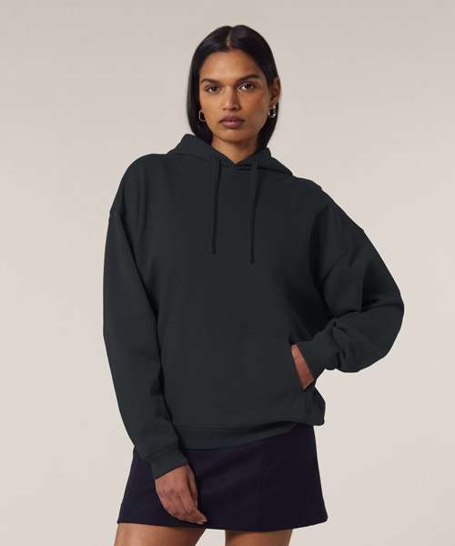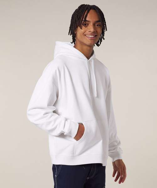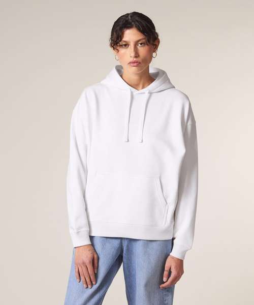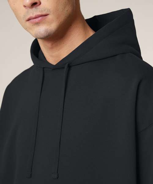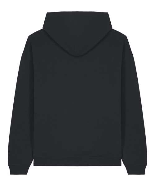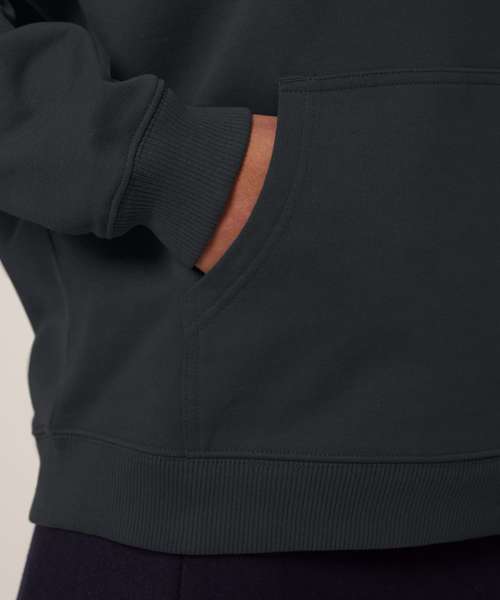 Set-in sleeve. Double-layered hood in self-fabric. Flat drawcords in matching body colour. Embroidered eyelets. Double-needle topstitch on all seams. 2x1 ribs at sleeve cuffs and bottom hem. Kangaroo pocket at front. Inside herringbone back neck tape. Self-fabric half moon at back neck.