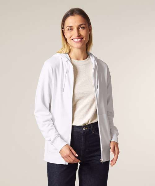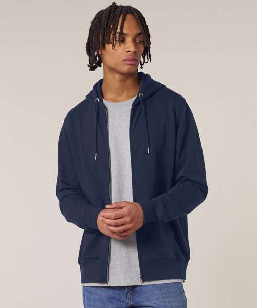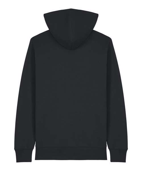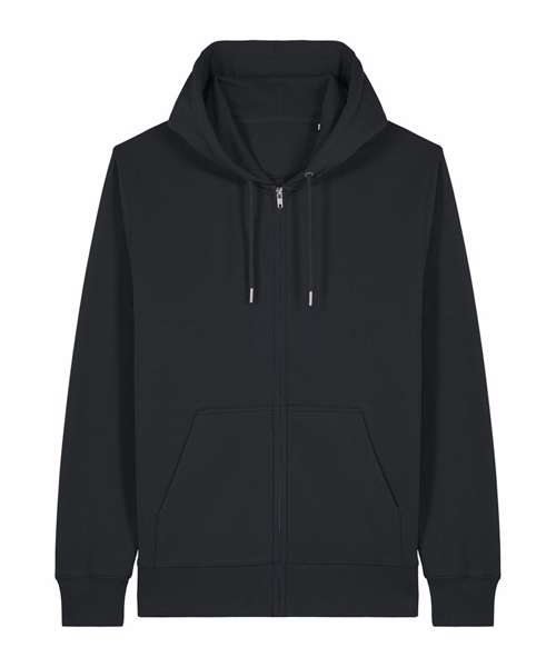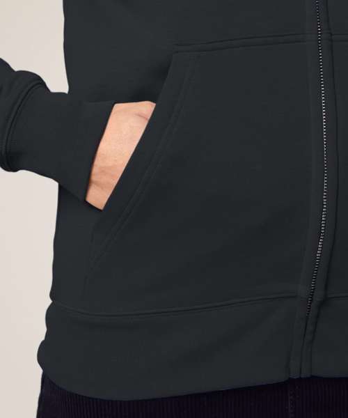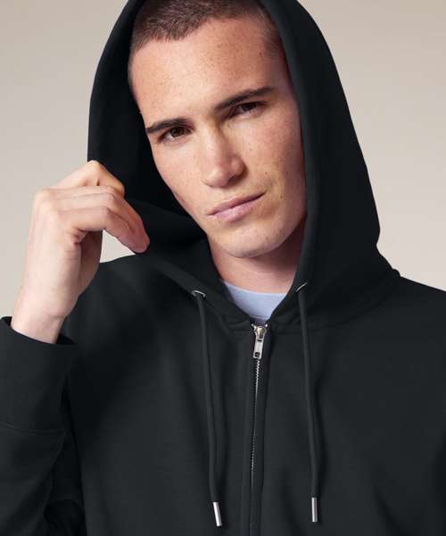 Set-in sleeves. Self-fabric lined hood. Covered metal zip at centre front. Round drawcords in matching body colour with closed metal tipping. Metal eyeletss. 1x1 rib at sleeve cuffs and bottom hem. Kangaroo pocket. Double-needle topstitches at the armhole, sleeve cuffs and bottom hem. Herringbone tape at the inside back neck seam and inside of the zip. Self-fabric half moon at back neck.